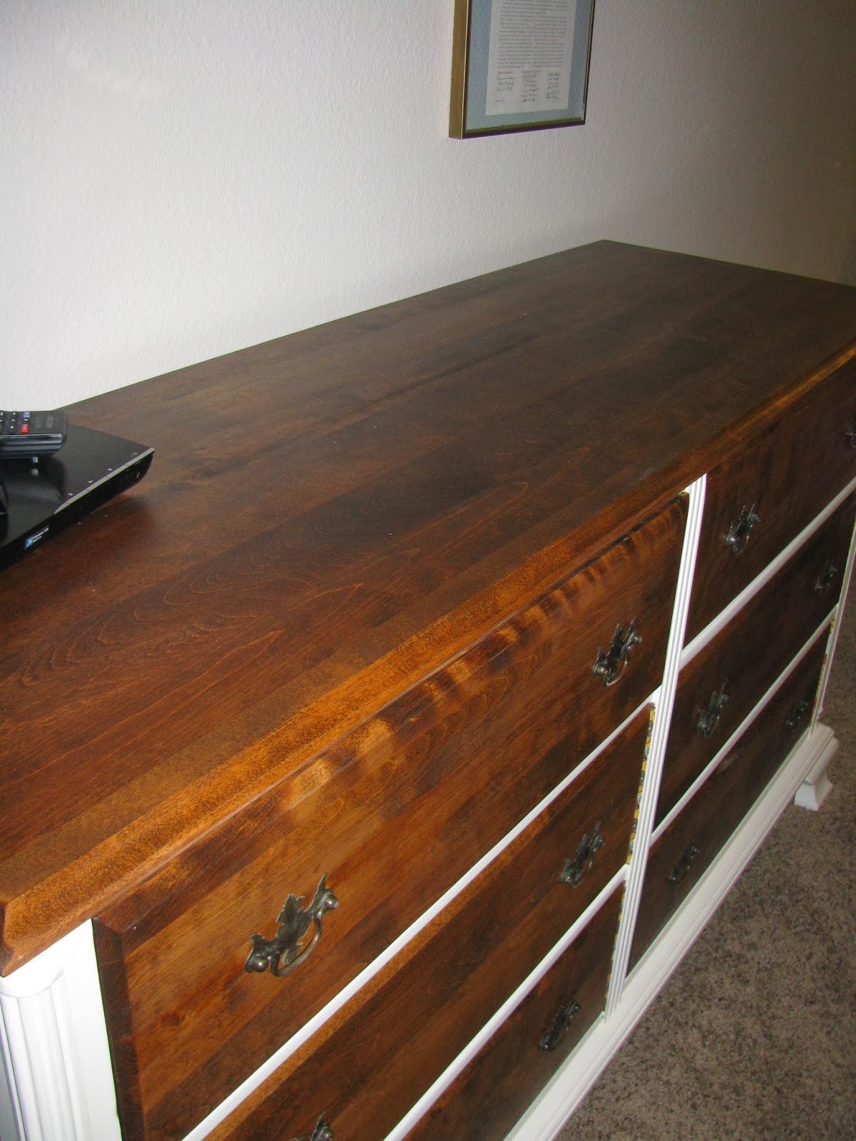 We did some furniture swapping around our home and our dream dresser ended up in the living room. Well, teal was not the right color for that room so to the garage he went to get a makeover. We striped the paint and sanded the top. I think this is the best he has ever looked.